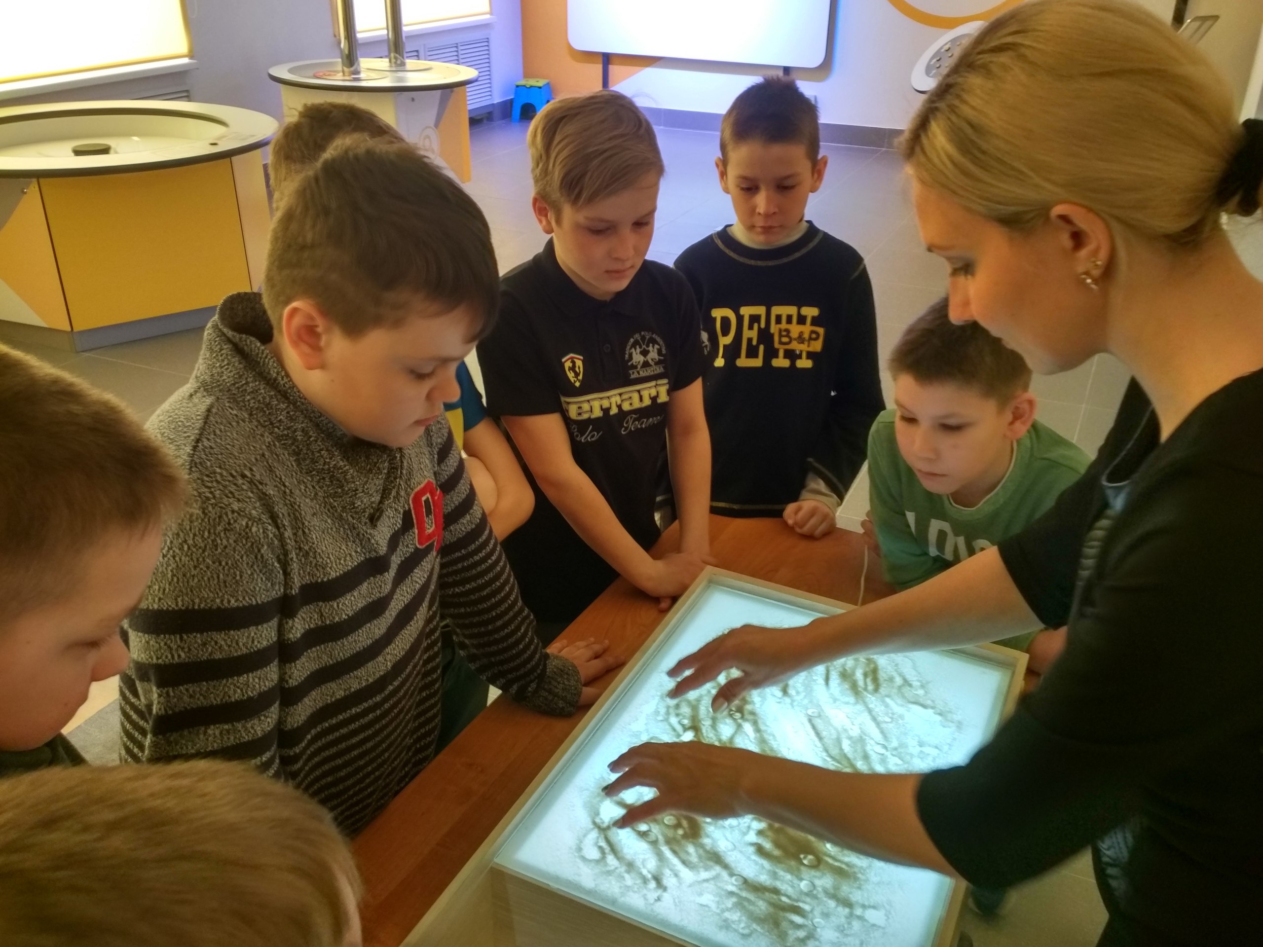 Ребята провели эксперимент и в зоне "Оптика", где рисовали светом на космическую тематику, изучая вещество люминофор, способное преобразовывать поглощаемую им энергию в световое излучение. Познакомились со световым столом и песочной анимацией. Изображение, полученное путём работы с сыпучим материалом на светящейся поверхности, допускает быстрое воспроизведение и легко трансформируется.