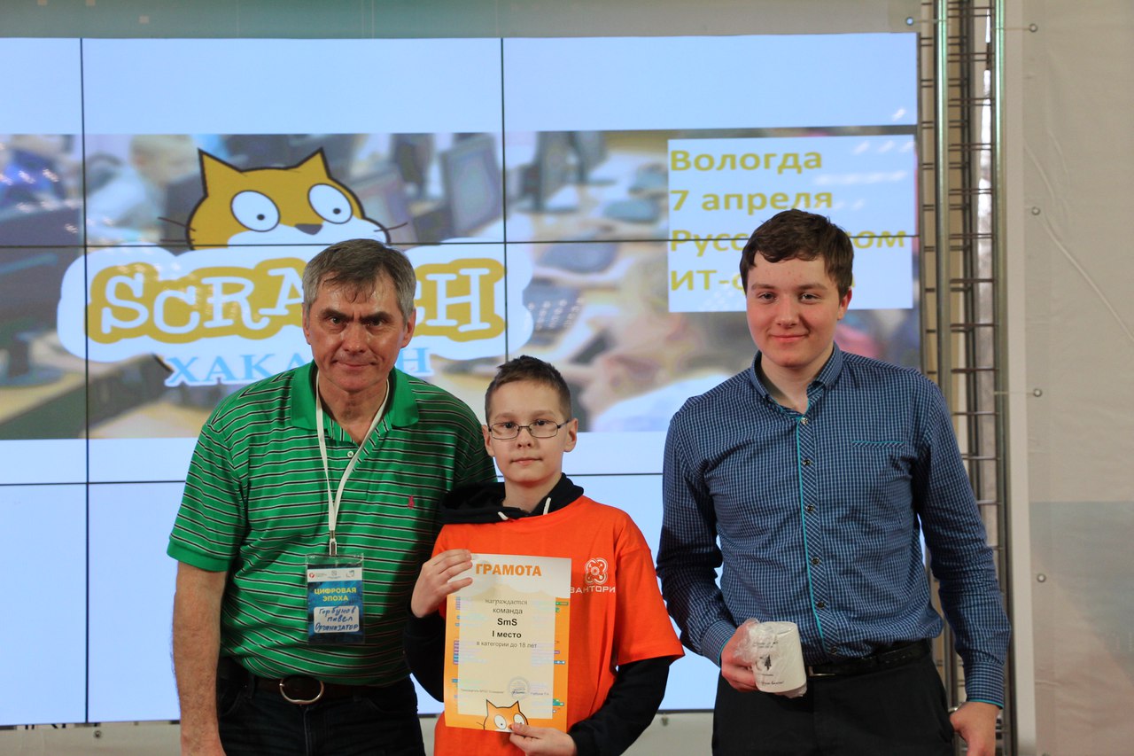 7 апреля в Вологде, во время Девятого Межрегионального ИТ-форума , в рамках в рамках проекта «Твой курс: ИТ для молодежи» состоялся Скретч-хакатон. В хакатоне приняло участие 50 детей от 7 до 14 лет из Вологды, Череповца и Сокола. Победителями стали учащиеся IT-квантума Евгений Сухарев и Александр Аганин.