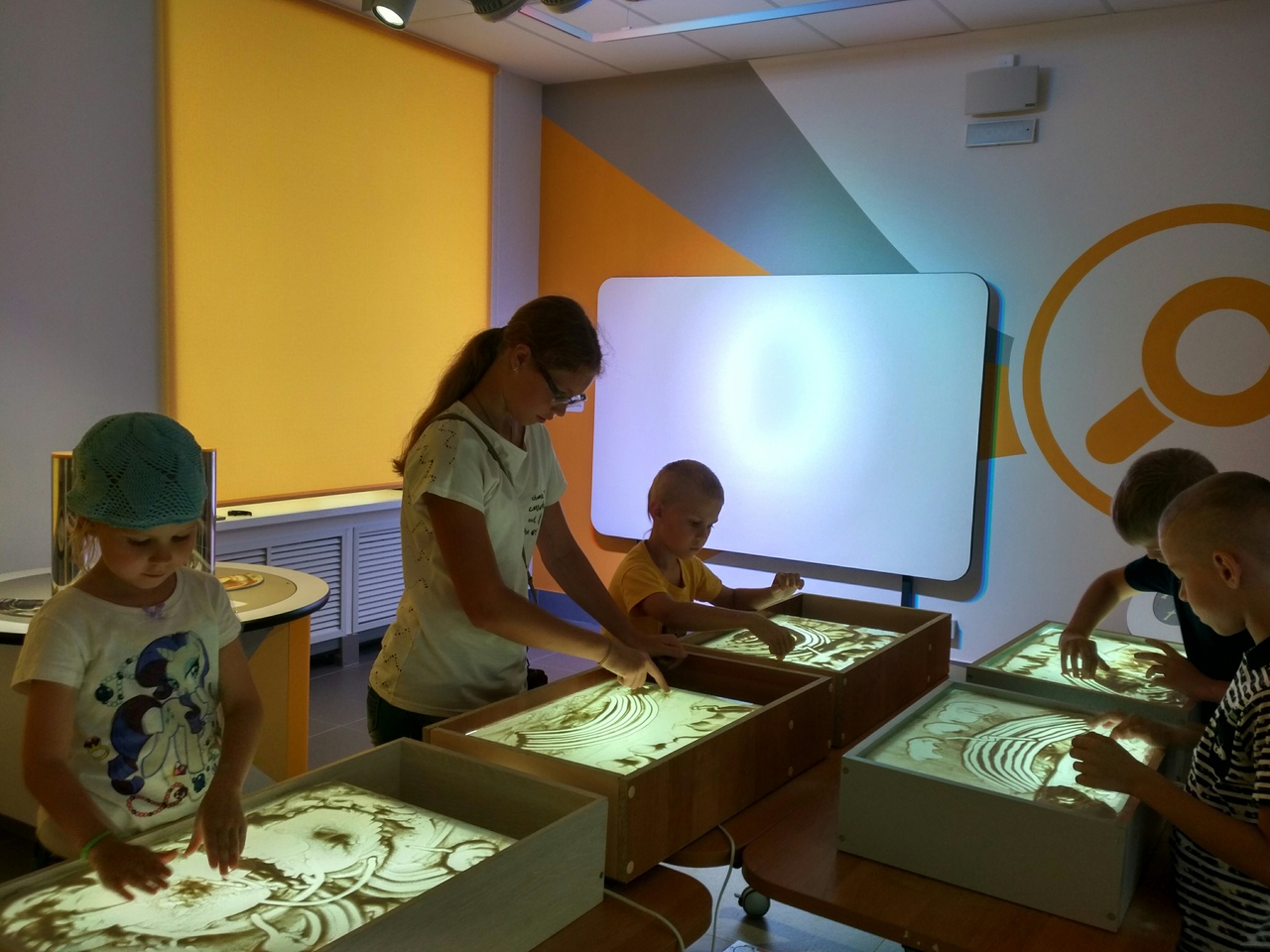 В интерактивной зоне "ОПТИКА" прошел мастер-класс на тему: "Почему появляется радуга?". Ребята изобразили радугу не только песком, рисуя на светящейся поверхности, но и световым лучом. Провели эксперимент, как разноцветная дуга появляется оттого, что луч света преломляется в капельках воды.