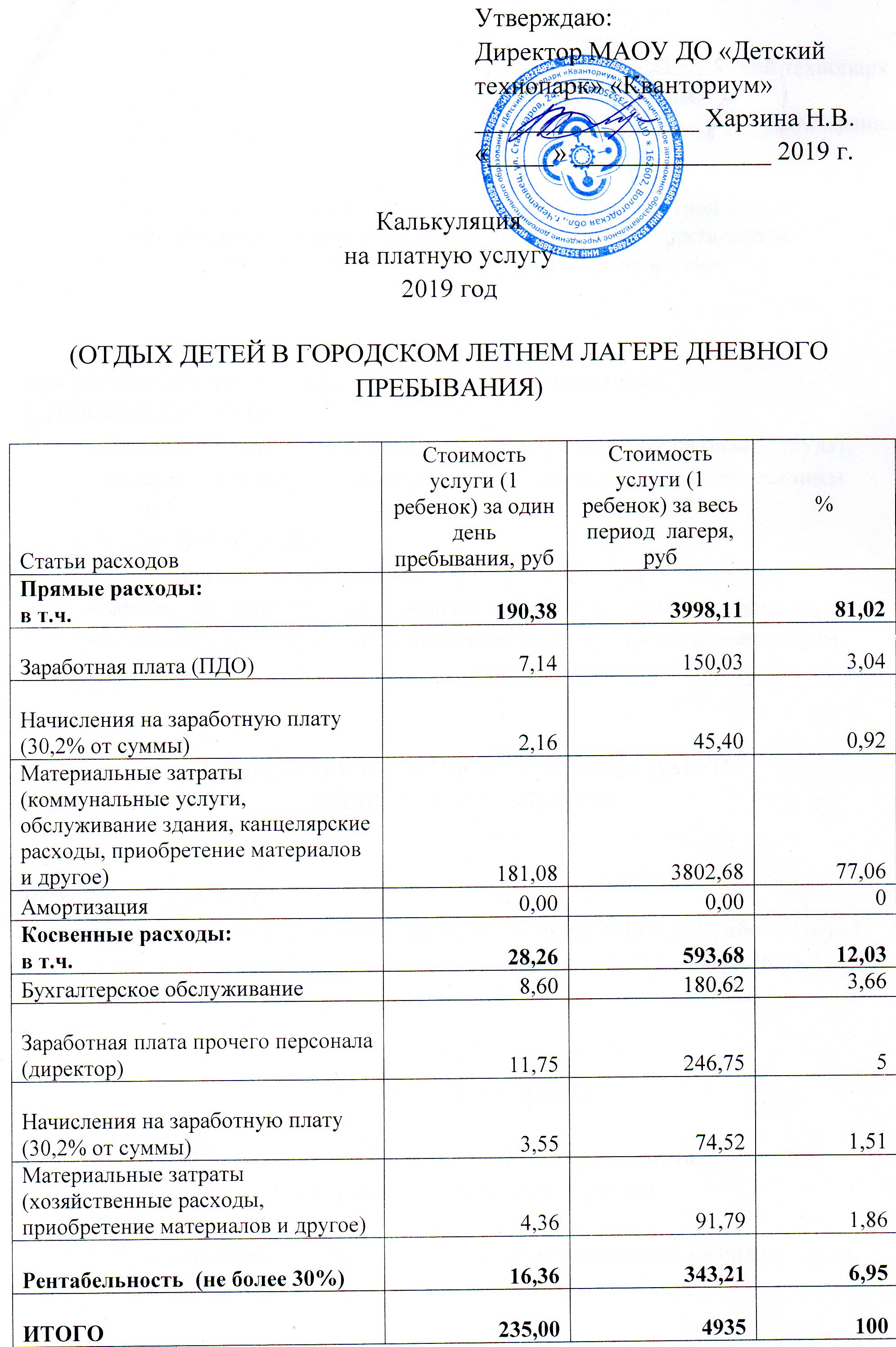 Калькуляция на платную услугу "Отдых детей в городском летнем лагере дневного пребывания"