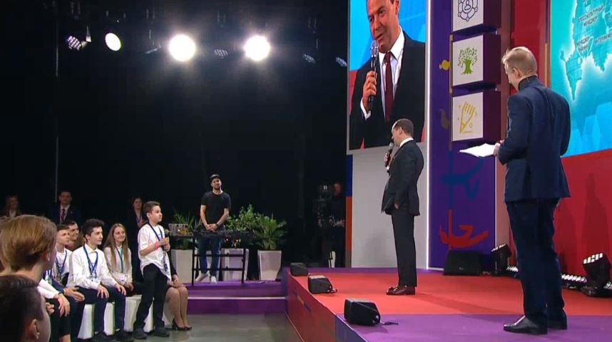 Череповецкие кванторианцы: Елисей Школьников, Анастасия Мартынова, Дарьяна Луканичева, Семён Бикин, наставник VR/ARквантум Михаил Хаменок и директор детского технопарка «Кванториум» Наталья Харзина принимают участие во Всероссийском открытом уроке «Профессия - руководитель». Почетным гостем мероприятия стал председатель Правительства Российской Федерации, Дмитрий Медведев.